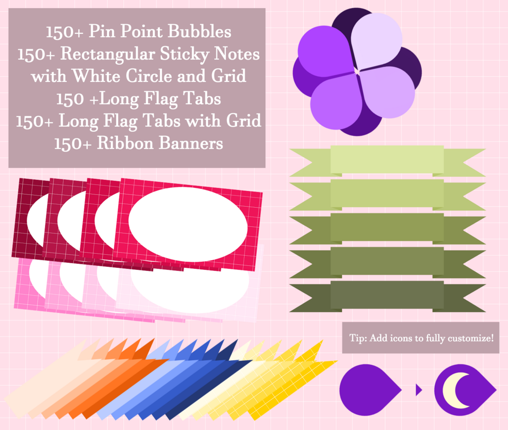 ✨ Tired of a limited selection of colors? This digital planner and bullet journal sticker set has got you covered. With over 150+ color options for sticky note tabs, multiple patterns, and different shapes for tabs, banners, and stickers, you're sure to customize your BuJo to your heart's content. This kit includes over 1,500 stickers.